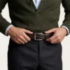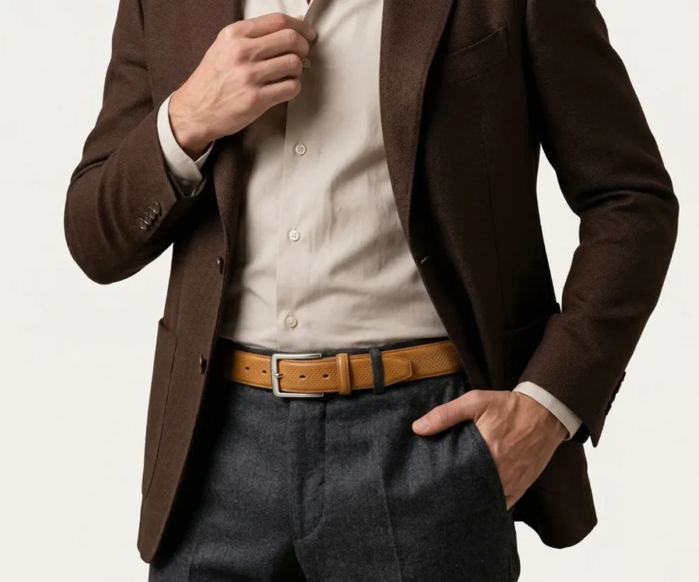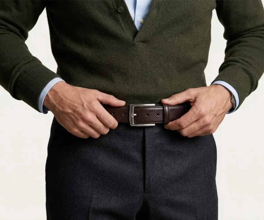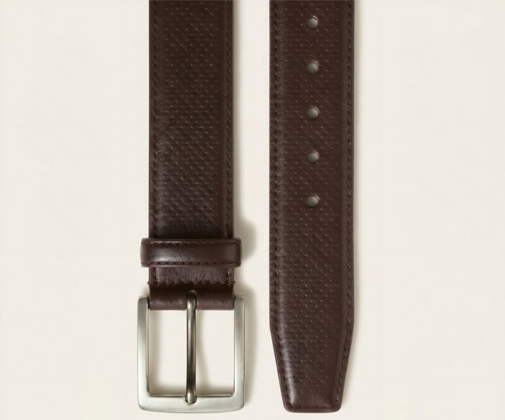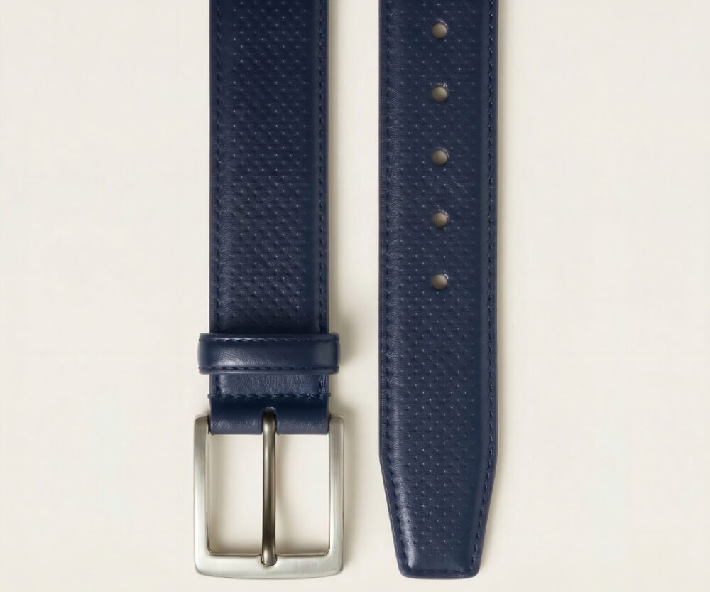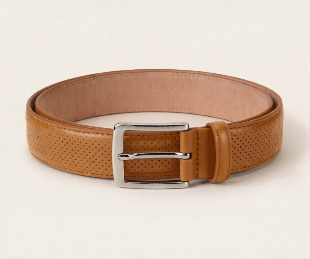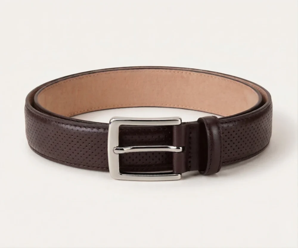 Este cinturón redefine la formalidad con una sofisticada piel napa grabada en un meticuloso patrón de micro-círculos. Su reverso en suave Vaqueta natural ofrece un confort excepcional y peso ligero. Rematado con costuras precisas y una hebilla minimalista plateada, es el toque de textura audaz que define un estilo diferencial.