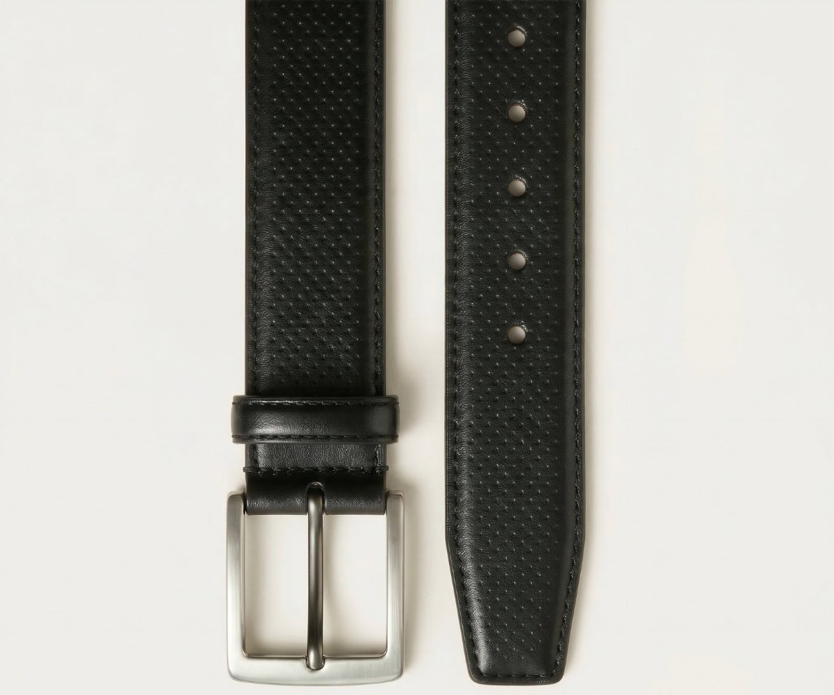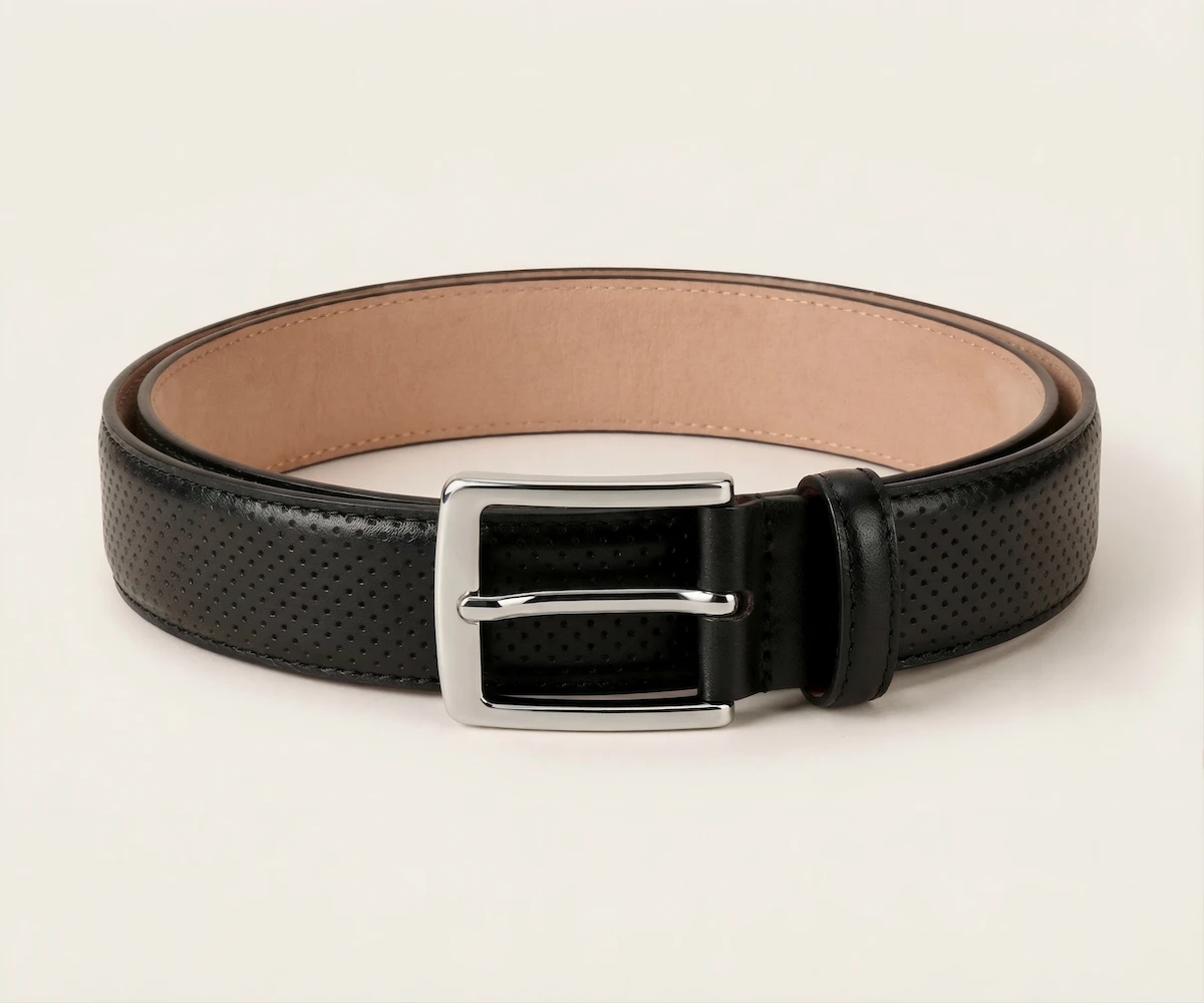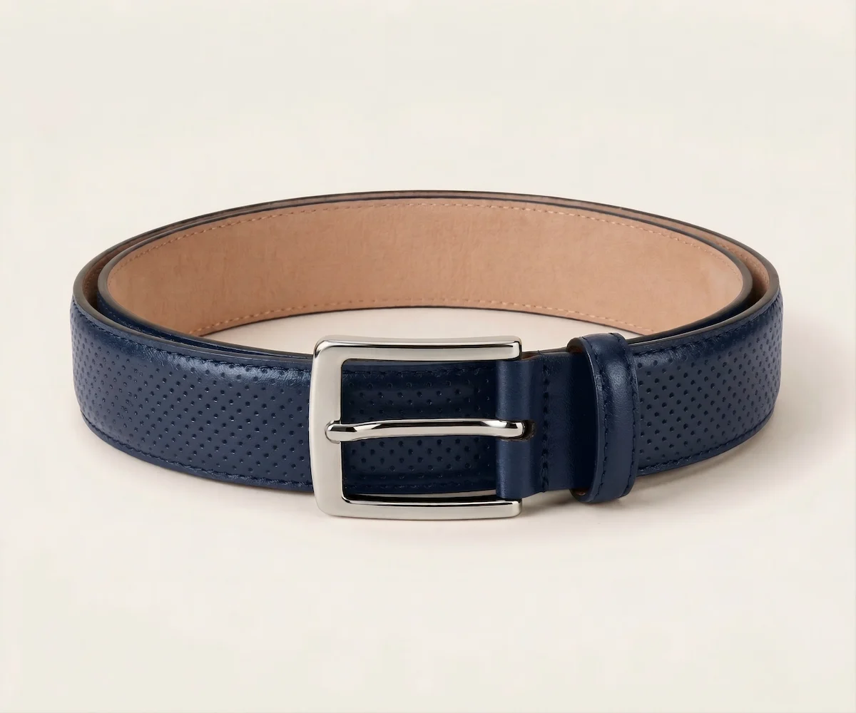 Este cinturón redefine la formalidad con una sofisticada piel napa grabada en un meticuloso patrón de micro-círculos. Su reverso en suave Vaqueta natural ofrece un confort excepcional y peso ligero. Rematado con costuras precisas y una hebilla minimalista plateada, es el toque de textura audaz que define un estilo diferencial.