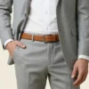 Rodee la zona elegida con la cinta métrica y anote la cifra donde se solapa. También puede medir el largo de su cinturón favorito desde la mitad de la hebilla hasta el orificio que más utilice.